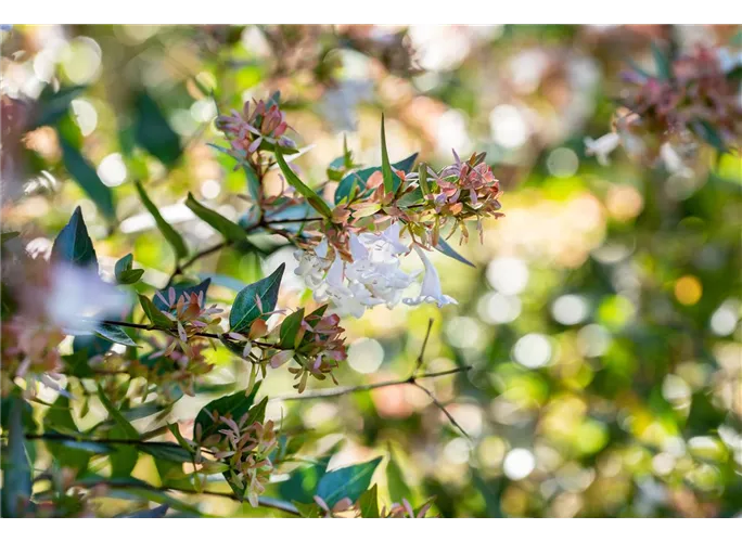 Ab Juli bringt sie angenehm duftende, rosafarbene Blüten hervor. An einem sonnigen bis halbschattigen Standort wird Abelia chinensis bis zu 2 m hoch und 2 m breit.