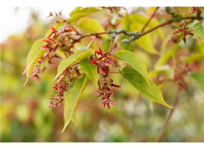 Der Schlangenhaut-Ahorn 'Serpentine' (Acer davidii) ist ein sommergrünes Laubgehölz mit lanzettlichen Blätter, die im Austrieb noch blutrot gefärbt sind. Mit der Zeit werden sie dann dunkelgrün. Zum Herbst nimmt das Laub eine schöne goldgelbe Färbung an. Ab Mai bringt er Blüten hervor. Bei den Früchten des Schlangenhaut-Ahorn 'Serpentine' handelt es sich um Flügelfrüchte. An einem sonnigen bis halbschattigen Standort mit durchlässiger, humoser und nährstoffreicher Erde wird er bis zu 15 m hoch und 10 m breit.