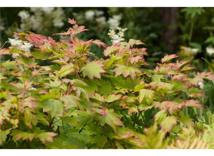 Der Japanische Ahorn 'Vitifolium' (Acer japonicum) ist ein sommergrünes Laubgehölz mit geschnittenen, gelappten, mittelgrünen Blätter. Zum Herbst nimmt das Laub eine schöne orangegelbe bis orange-rote Färbung an. Ab April bringt er purpurrote Blüten hervor. Die roten Flügelfrüchte des Japanischen Ahorn 'Vitifolium' sind ein Blickfang. An einem sonnigen Standort mit durchlässiger, humoser und kalkfreier Erde wird er bis zu 5 m hoch und 5 m breit. Im Kübel auf Balkon oder Terrasse macht dieses Laubgehölz ebenso eine gute Figur.