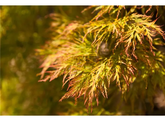 Der Grüne Schlitzahorn 'Dissectum' (Acer palmatum) ist ein sommergrünes Laubgehölz, das mit seinem dekorativen Laub auffällt. Die tief geschlitzten Blätter sind hellgrün gefärbt. Zum Herbst nimmt das Laub eine schöne orange-rote Färbung an. Ab Mai bringt er purpurrote Blüten hervor. Die Flügelfrüchte des Grünen Schlitzahorn 'Dissectum' sind im reifen Zustand rot gefärbt. An einem sonnigen bis halbschattigen Standort mit durchlässiger und lockerer Erde wird er bis zu 2 m hoch und 3 m breit. Im Kübel auf Balkon oder Terrasse macht dieses Laubgehölz ebenso eine gute Figur.