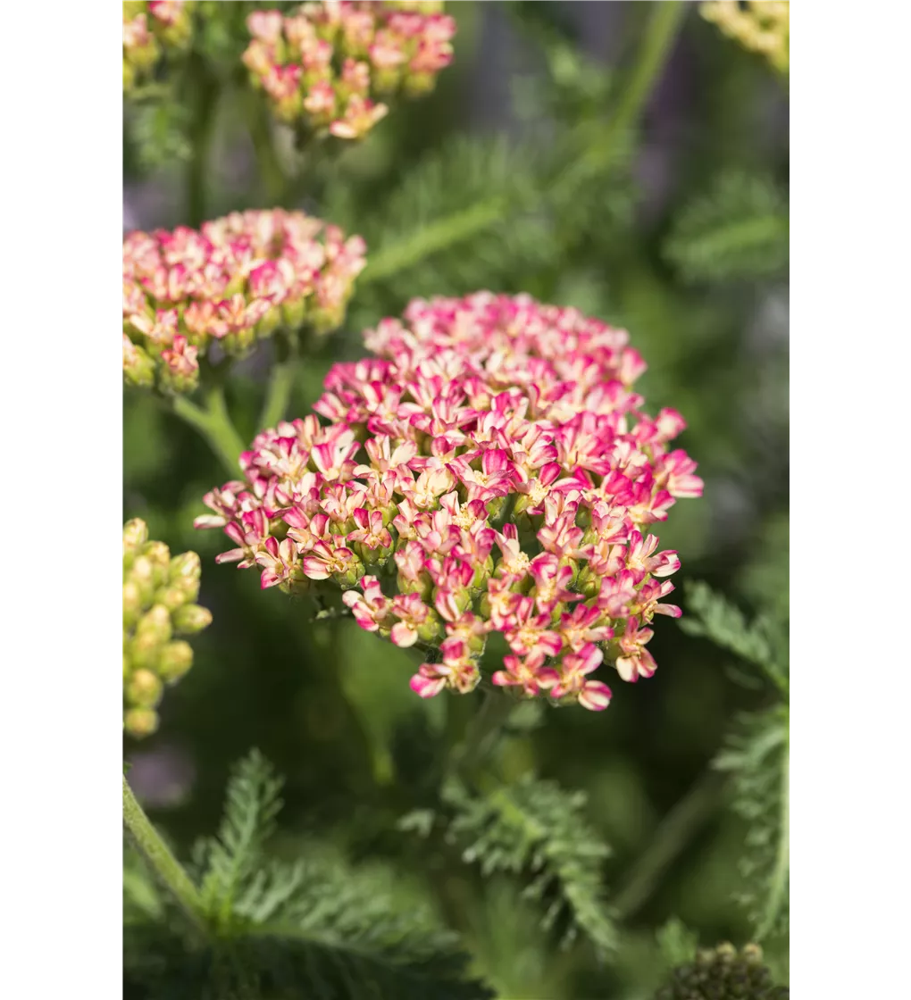 Die Schafgarbe 'Desert Eve' (Achillea millefolium) ist eine sommergrüne Staude, die ab Juni mit prächtigen, angenehm duftenden, weißen, gelben, orangefarbenen oder roten Blüten aufwartet. Ihre gefiederten Blätter sind mittelgrün. An einem sonnigen bis halbschattigen Standort mit lockerer und nährstoffreicher Erde wird Achillea millefolium 'Desert Eve' bis zu 60 cm hoch und 40 cm breit. Diese Staude ist auch sehr schön in Kübel auf Balkon oder Terrasse.