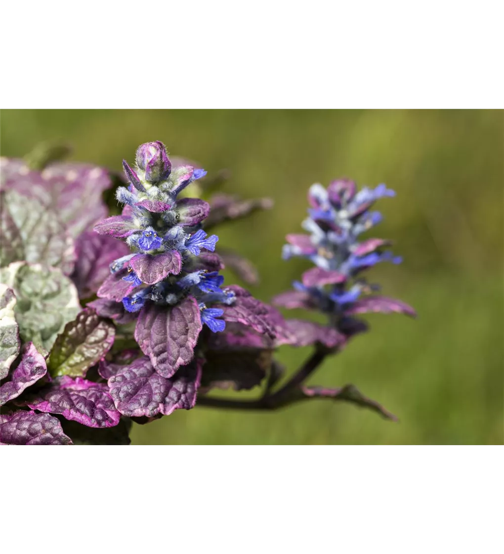 Der Kriechende Günsel (Ajuga reptans) ist eine wintergrüne Staude, die ab April mit prächtigen, blauen Blüten aufwartet. Seine eiförmigen, ganzrandigen Blätter sind mehrfarbig. An einem sonnigen bis halbschattigen Standort mit durchlässiger, humoser und nährstoffreicher Erde wird Ajuga reptans 'Rainbow' bis zu 15 cm hoch und 25 cm breit.