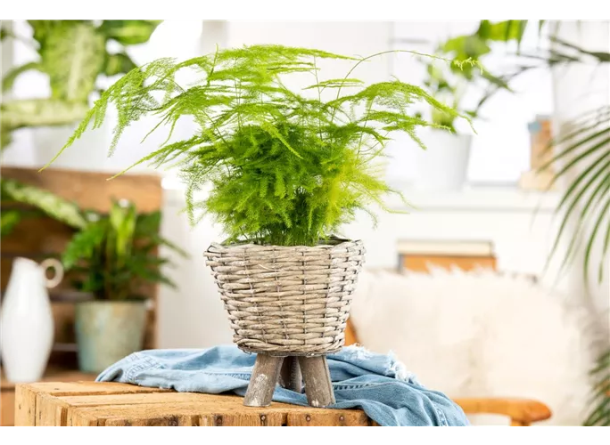 Der Feder-Spargel (Asparagus setaceus) ist eine dekorative Zimmerpflanze mit nadelförmigen, mittelgrünen Blätter. An einem sonnigen bis halbschattigen Standort und in durchlässigem, humosem, nährstoffreichem und sandigem Substrat wird er bis zu 60 cm hoch und 60 cm breit.