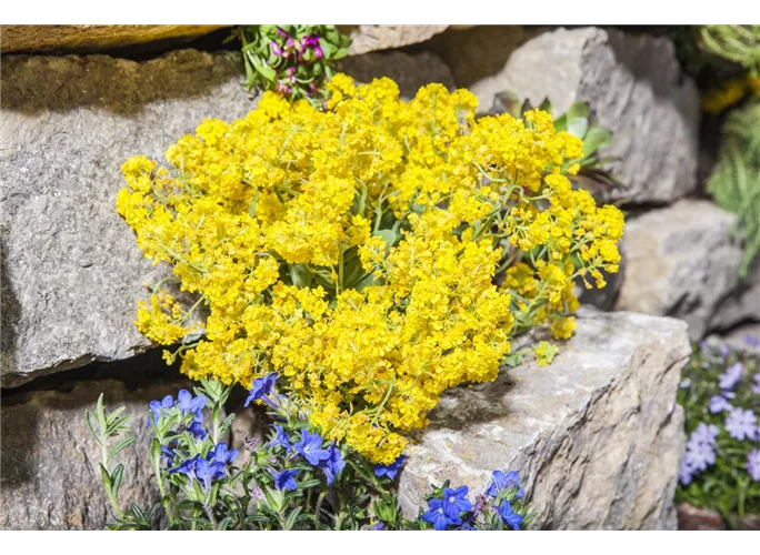Das Felsen-Steinkraut (Aurinia saxatilis) ist eine wintergrüne Staude, die ab April mit prächtigen, gelben Blüten aufwartet. Seine lanzettlichen Blätter sind grau-grün. An einem sonnigen bis halbschattigen Standort mit durchlässiger, sandiger und lehmiger Erde wird Aurinia saxatilis bis zu 30 cm hoch und 40 cm breit. Diese Staude ist auch sehr schön in Kübel auf Balkon oder Terrasse.