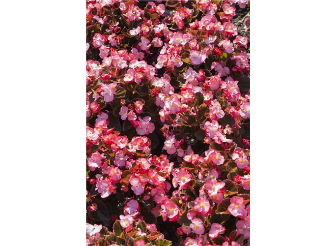 Die Eis-Begonie (Begonia semperflorens) ist eine einjährige Pflanze, die ab Mai mit prächtigen, weißen, rosafarbenen oder roten Blüten aufwartet. Ihre eiförmigen Blätter sind grün-rot. An einem sonnigen bis halbschattigen Standort mit durchlässiger und nährstoffreicher Erde wird Begonia semperflorens bis zu 30 cm hoch und 40 cm breit.