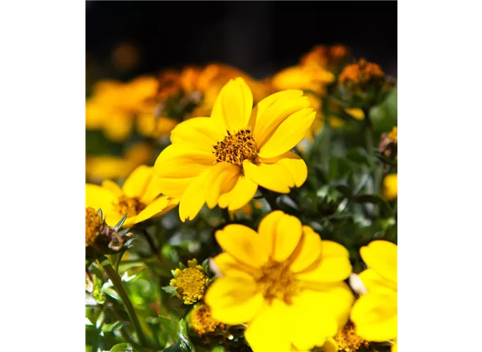 Der Zweizahn 'Rockstar' (Bidens) ist eine Pflanze, die mit prächtigen, goldgelben Blüten aufwartet. An einem sonnigen Standort mit durchlässiger, humoser und nährstoffreicher Erde wird Bidens 'Rockstar' bis zu 60 cm hoch.