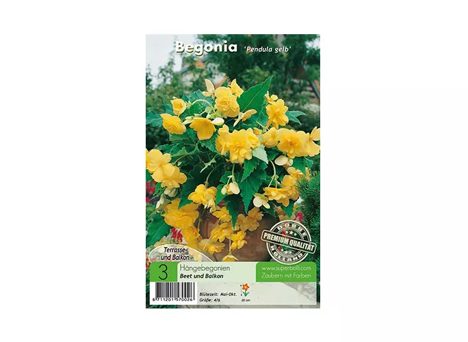 Die Hänge-Begonie, gelb (Begonia pendula) ist eine Pflanze, die ab Juni mit prächtigen, gelben Blüten aufwartet. An einem halbschattigen Standort mit durchlässiger und humoser Erde wird Begonia pendula, gelb bis zu 30 cm hoch und 50 cm breit. In einer Blumenampel macht sich die Hänge-Begonie, gelb besonders gut.