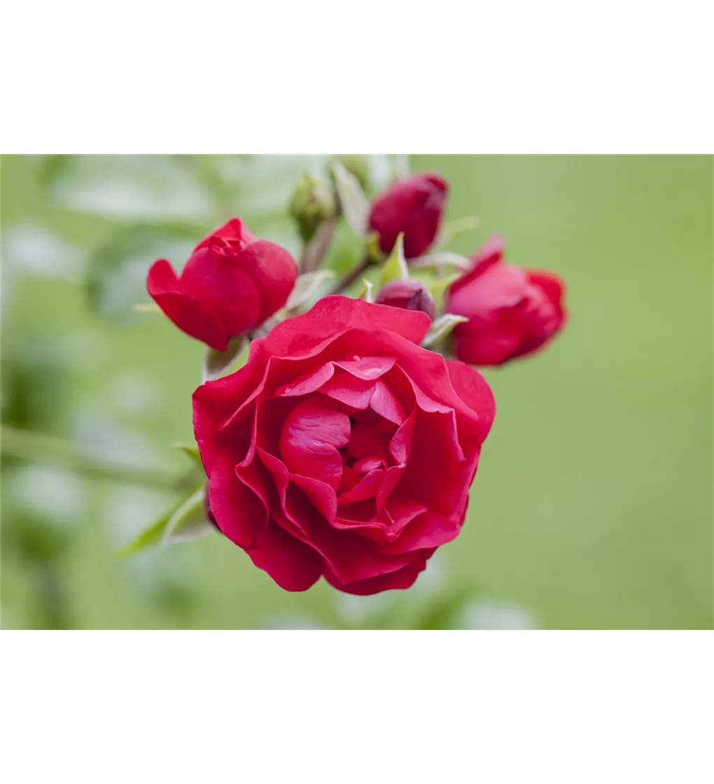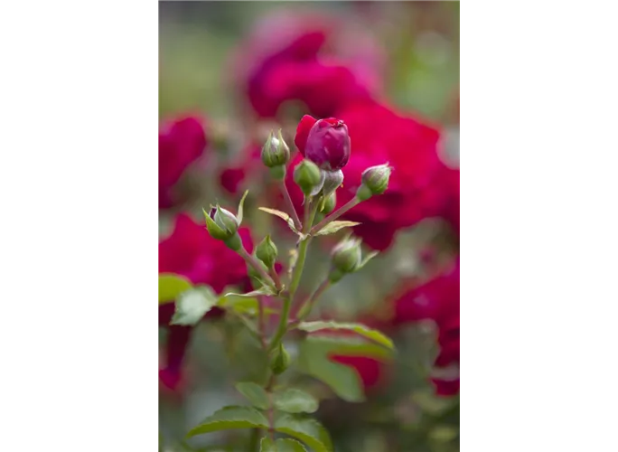 Die Bodendeckerrose (Rosa) präsentiert ab Juni ihre prächtigen, gefüllten Blüten. Ihre gefiederten Blätter sind mittelgrün. An einem sonnigen Standort mit durchlässiger und nährstoffreicher Erde wird Bodendeckerrose bis zu 50 cm hoch und 50 cm breit.