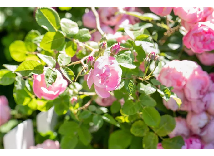 Die Bodendeckerrose 'The Fairy' (Rosa) präsentiert ab Juni ihre prächtigen, rosafarbenen, gefüllten Blüten. Ihre gefiederten Blätter sind hellgrün. An einem sonnigen bis halbschattigen Standort mit durchlässiger und humoser Erde wird Rosa 'The Fairy' bis zu 60 cm hoch und 50 cm breit. Die Bodendeckerrose 'The Fairy' ist auch eine schöne Kübelpflanze.