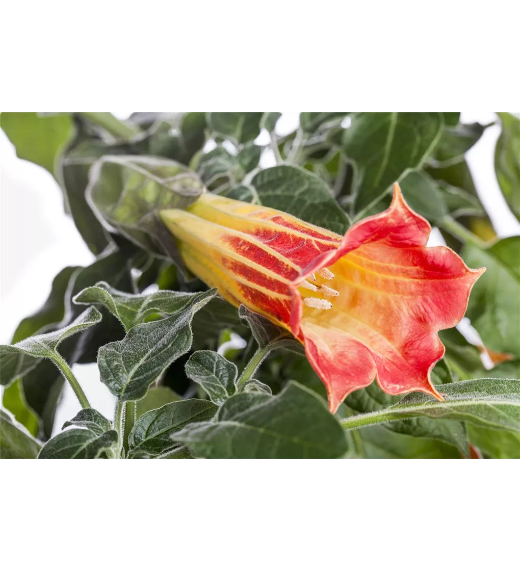 Ab Juni bringt sie angenehm duftende, weiße Blüten hervor. An einem sonnigen Standort mit durchlässiger, humoser und nährstoffreicher Erde wird Brugmansia suaveolens bis zu 2 m hoch und 2,5 m breit.