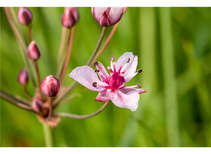 Die Schwanenblume (Butomus umbellatus) ist eine sommergrüne Wasserpflanze, die ab Juni mit prächtigen, rosafarbenen Blüten aufwartet. Ihre lanzettlichen Blätter sind dunkelgrün. Butomus umbellatus braucht mindestens eine Wassertiefe von 10 cm, in sonniger bis halbschattiger Lage. Dann wird diese Pflanze bis zu 1,2 m hoch und 40 cm breit.