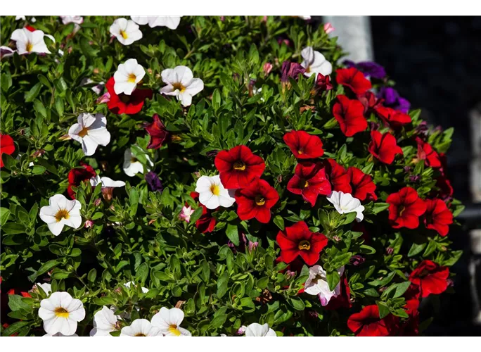 Das Zauberglöckchen 'Confetti' (Calibrachoa) ist eine einjährige Pflanze, die ab April mit prächtigen, bunten Blüten aufwartet. An einem sonnigen bis halbschattigen Standort mit durchlässiger, nährstoffreicher und lehmiger Erde wird Calibrachoa 'Confetti' bis zu 60 cm hoch und 30 cm breit. In einer Blumenampel macht sich das Zauberglöckchen 'Confetti' besonders gut.