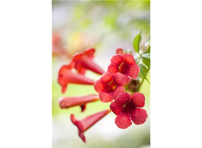 Die Rote Kletter-Trompetenblume (Campsis radicans) ist eine sommergrüne Kletterpflanze mit gefiederten, mittelgrünen Blätter. Ab Juli bringt sie angenehm duftende, rote Blüten hervor. An einem sonnigen bis halbschattigen Standort mit durchlässiger und nährstoffreicher Erde wird sie bis zu 12 m hoch und 6 m breit.