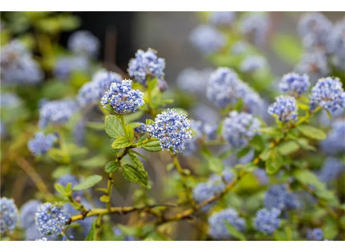 Die Kriechende Säckelblume (Ceanothus thyrsiflorus var. repens) ist ein immergrünes Laubgehölz mit rundlichen, mittelgrünen Blätter. Ab März bringt sie angenehm duftende, blaue Blüten hervor. An einem sonnigen bis halbschattigen Standort mit durchlässiger, nährstoffreicher und sandiger Erde wird sie bis zu 1 m hoch und 2,5 m breit. Im Kübel auf Balkon oder Terrasse macht dieses Laubgehölz ebenso eine gute Figur.
