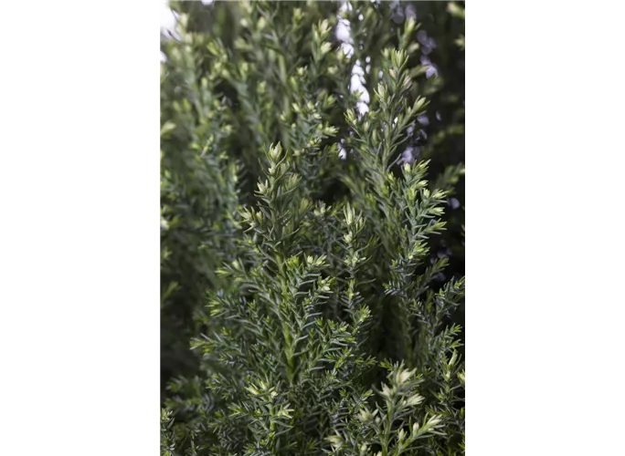 Dieses immergrüne Nadelgehölz zeigt sich mit besonders prächtigen Nadeln. Schon der Austrieb, fällt mit seiner cremeweißen Farbe ins Auge. Die Nadelfarbe wandelt sich dann im Laufe der Zeit zu einem schönen Grau-grün. Die schuppenförmigen Nadeln sind gegenständig angeordnet.