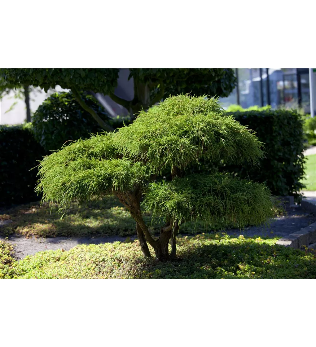 Die Fadenzypresse 'Filifera' (Chamaecyparis pisifera) ist ein immergrünes Nadelgehölz, das mit seiner dekorativen Benadelung auffällt. An einem sonnigen bis halbschattigen Standort mit lockerer und nährstoffreicher Erde wird sie bis zu 3 m hoch und 3 m breit.