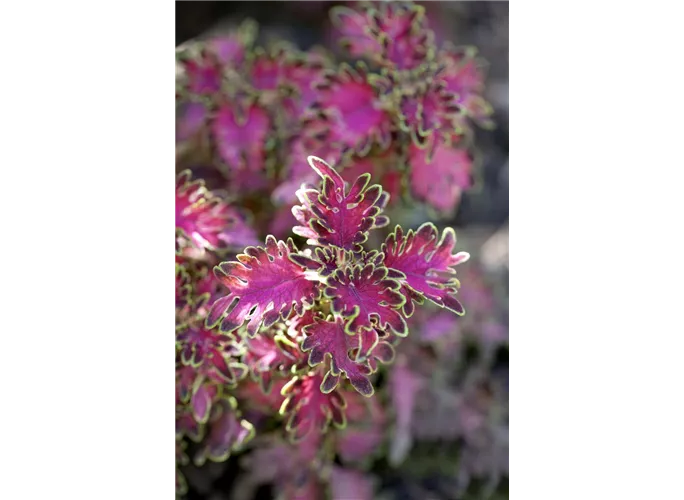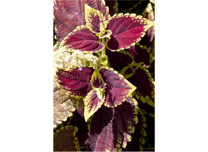 Die Buntnessel (Coleus blumei) ist eine Zimmerpflanze, die mit ihren dekorativen Blätter begeistert: Die eiförmigen oder lanzettlichen, gekerbten Blätter sind mehrfarbig gefärbt. Ein Highlight sind ihre unscheinbaren Blüten, die ab Juni erscheinen. An einem sonnigen bis halbschattigen Standort und in durchlässigem und nährstoffreichem Substrat wird sie bis zu 50 cm hoch und 40 cm breit.