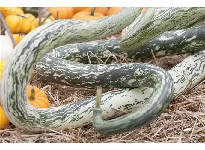 Der Flaschenkürbis (Cucurbita lagenaria) ist eine beliebte, einjährig Gemüsepflanze. Seine Früchte haben einen unverwechselbaren, aromatischen Geschmack. Geerntet werden kann ab Ende September. Weiße mit gelber Mitte Blüten gehen den Früchten ab Juli voraus. An einem sonnigen Standort mit durchlässiger, humoser und nährstoffreicher Erde wird er bis zu 3 m hoch und 1,5 m breit.