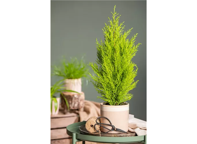 Die Zypresse 'Wilma' (Cupressus macrocarpa) ist eine dekorative Zimmerpflanze mit nadelförmigen, gelb-grünen Blätter. An einem hellen Standort und in durchlässigem Substrat wird sie bis zu 3 m hoch und 1 m breit.