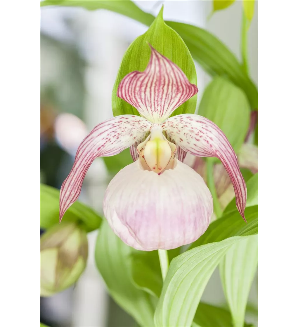 Der Frauenschuh (Cypripedium) präsentiert ab April prächtige Blüten. An einem sonnigen bis halbschattigen Standort mit durchlässiger, humoser und nährstoffreicher Erde wird Cypripedium bis zu 60 cm hoch und 40 cm breit.