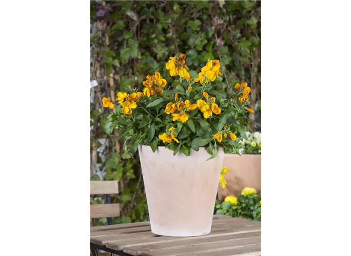 Der Goldlack (Erysimum cheiri) ist eine sommergrüne Staude, die ab April mit prächtigen, stark duftenden, gelben, orangefarbenen oder roten Blüten aufwartet. Seine lanzettlichen Blätter sind dunkelgrün. An einem sonnigen Standort mit durchlässiger Erde wird Erysimum cheiri bis zu 60 cm hoch und 30 cm breit. Diese Staude ist auch sehr schön in Kübel auf Balkon oder Terrasse.