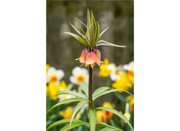 Von April bis Mai erscheinen die Blüten von Fritillaria imperialis 'Garland Star'. Sie sind von orange-roter Farbe.