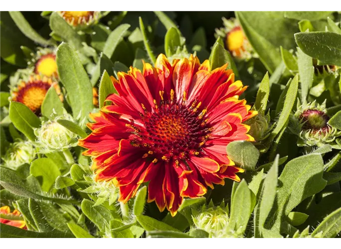 Die Prärie-Kokardenblume (Gaillardia aristata) ist eine sommergrüne Staude, die ab Juli mit prächtigen, gelb-roten, orange-roten oder gelb-orangenen Blüten aufwartet. Ihre lanzettlichen Blätter sind mittelgrün. An einem sonnigen Standort mit durchlässiger, humoser und sandiger Erde wird Gaillardia aristata SpinTop bis zu 45 cm hoch und 45 cm breit. Diese Staude ist auch sehr schön in Kübel auf Balkon oder Terrasse.