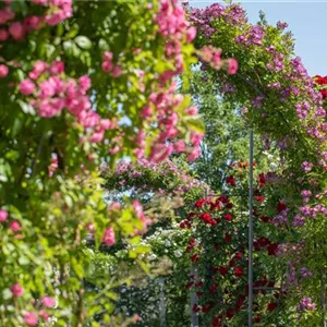 Kletterpflanzen bieten für den Garten eine Vielzahl von Einsatz- und Gestaltungsmöglichkeiten. Wer erstmal klein anfangen möchte, der holt sich für seine Kletterpflanzen eine kleine Pyramide, um die sich die Arme der Kletterpflanze winden können. Dann sollte aber auch auf die Wuchseigenschaften der Pflanze geachtet werden. Ein bisschen höher hinaus geht es dann mit einem Rankgitter oder einem Spalier. Die lassen sich an einer Hauswand befestigen und sorgen so dafür, dass die Pflanze ganz einfach nach oben klettern kann. Aber Kletterpflanzen können nicht nur in den Himmel klettern, sondern auch hoch und runter. Natürlich nur, wenn man ihnen zeigt, wie das geht. So kann man mit Kletterpflanzen auch einen Bogen begrünen, der den Eingang zum Garten bilden kann oder einfach eine gemütliche Sitzecke einrahmt. Wer dann noch Kletterpflanzen mit duftenden Blüten pflanzt, fühlt sich unter dem Bogen wie auf Duftwolke 7. Und mit einigen Kletterpflanzen lassen sich ganz á la Dornröschen auch ganze Hauswände begrünen. Die große Auswahl an Kletterpflanzen macht all das möglich. Von wegen Märchen!