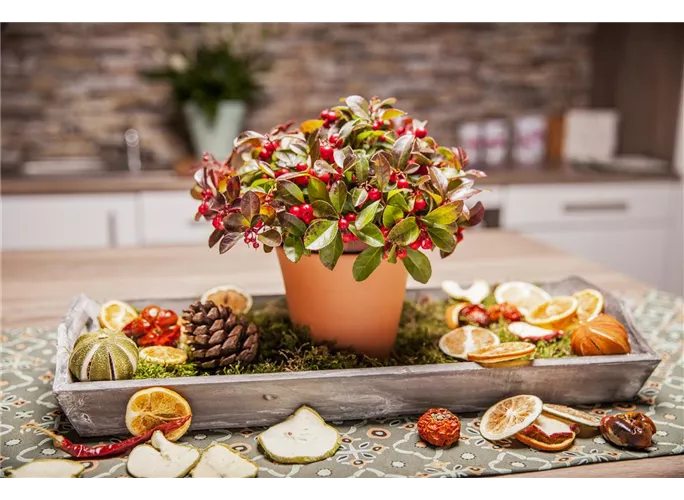 Die Niedere Scheinbeere 'Macrocarpa' (Gaultheria procumbens) ist ein immergrünes Laubgehölz, das mit seinem dekorativen Laub auffällt. Die eiförmigen Blätter sind dunkelgrün gefärbt. Ab Juli bringt sie hellrosafarbene Blüten hervor. Die roten, runden Früchte der Niederen Scheinbeere 'Macrocarpa' sind ein Blickfang, wenn sie im September reif sind. An einem halbschattigen Standort mit humoser, kalkfreier und saurer Erde wird sie bis zu 20 cm hoch und 40 cm breit. Im Kübel auf Balkon oder Terrasse macht dieses Laubgehölz ebenso eine gute Figur.