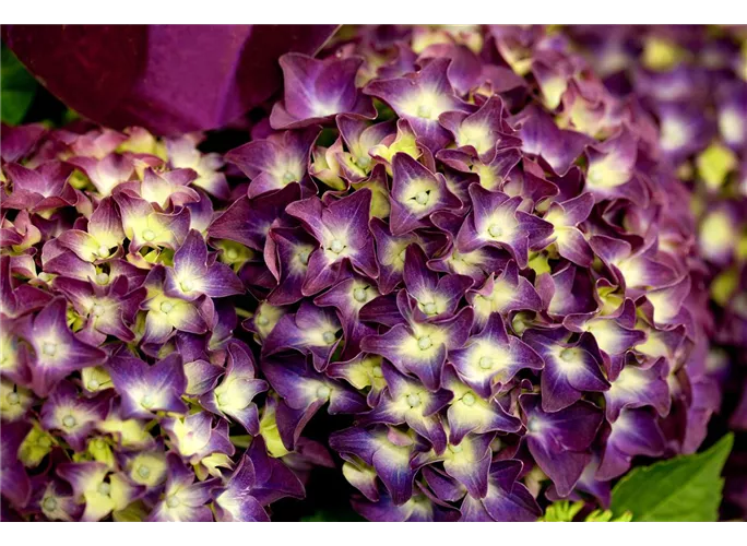 Von Juni bis September erscheinen die Blüten von Hydrangea macrophylla 'Music Collection'®. Sie sind von violetter Farbe. Die schalenförmigen Blüten sind in Dolden angeordnet.