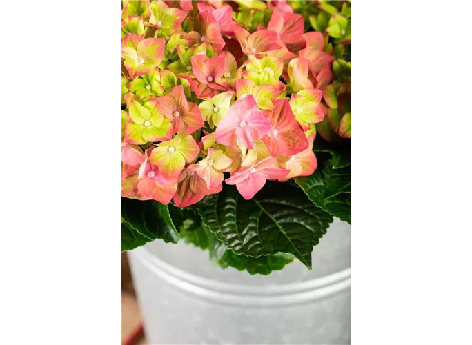 Die Bauernhortensie 'Rembrandt'® (Hydrangea macrophylla) ist ein sommergrünes Laubgehölz mit eiförmigen, gesägten, mittelgrünen Blätter. Ab Mai bringt sie rosafarbene, rote oder grüne Blüten hervor. An einem halbschattigen bis schattigen Standort mit humoser Erde wird sie bis zu 1,2 m hoch und 1,2 m breit. Im Kübel auf Balkon oder Terrasse macht dieses Laubgehölz ebenso eine gute Figur.
