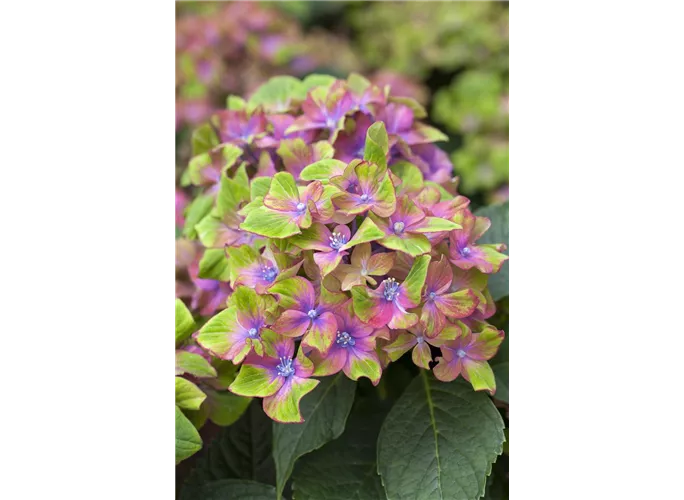 Von Juni bis September erscheinen die Blüten von Hydrangea macrophylla 'Saxon® Schloss Wackerbarth, Horwack(s)'. Sie sind von mehrfarbiger Farbe. Die schalenförmigen Blüten sind in Dolden angeordnet.