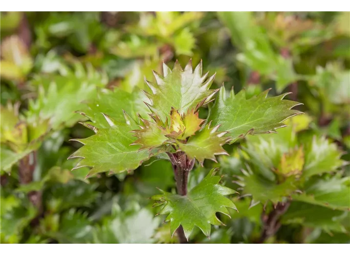 Die Amerikanische Ilex 'Little Rascal'® (Ilex meserveae) ist ein immergrünes Laubgehölz mit lanzettlichen, gesägten Blätter, die im Austrieb noch hellgrün gefärbt sind. Mit der Zeit werden sie dann dunkelgrün. Sie stellt keine großen Ansprüche an den Boden, jedoch sollte der Standort sonnigen bis halbschattigen sein. Dort wird dieses Laubgehölz bis zu 50 cm hoch und 70 cm breit. Im Kübel auf Balkon oder Terrasse macht dieses Laubgehölz ebenso eine gute Figur.