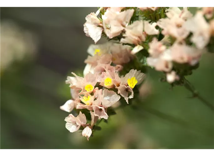 Von Juli bis September erscheinen die Blüten von Limonium sinuatum. Sie sind von weißer, gelber, lachsrosafarbener, violetter oder karminroter Farbe.