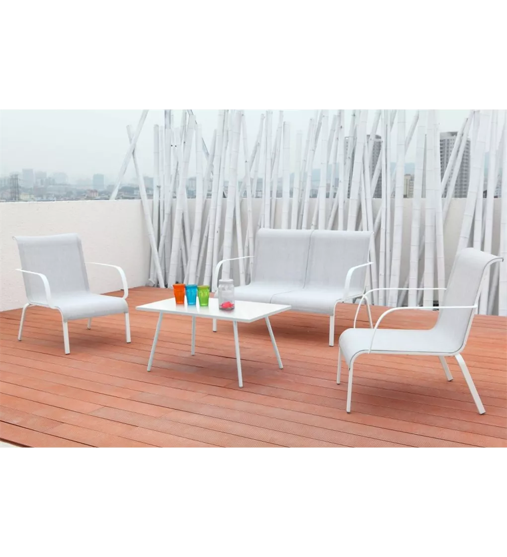 Das MaxPhil Lounge-Set präsentiert sich im modernen Design und besteht aus 2 Sessel, 1 Zweisitzer und 1 Tisch. Der Metallrahmen hat die Farbe Weiß, der Textilbezug ist in Grau gehalten. Die Bank sind 117 cm lang bei einer Sitztiefe von 50 cm und einer Höhe von 83 cm. Die beiden Sessel sind 67 cm breit bei einer Sitztiefe von 50 cm und einer Höhe von 83 cm. Der Tisch ist 90 x 50 cm bei einer Höhe von 42,5 cm.