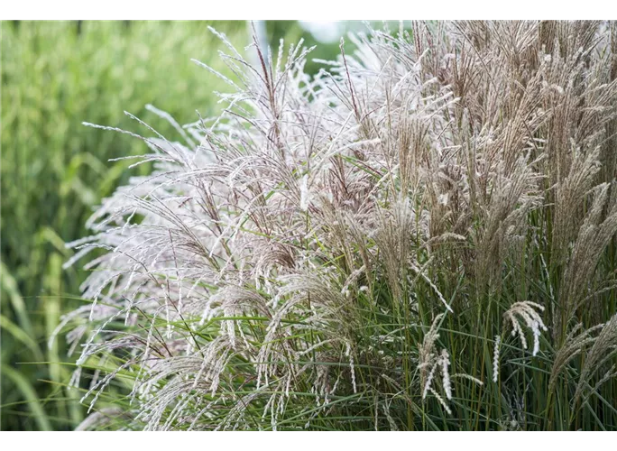 Das Garten-Chinaschilf (Miscanthus sinensis) ist ein sommergrünes Gras mit mittelgrünen Blättern. Ab September zeigt es seine cremeweißen bis braunen Blüten-Rispen. An einem sonnigen bis halbschattigen Standort mit durchlässiger, humoser und nährstoffreicher Erde wird es bis zu 1,2 m hoch und 80 cm breit. Miscanthus sinensis gilt als ausreichend frostfest.