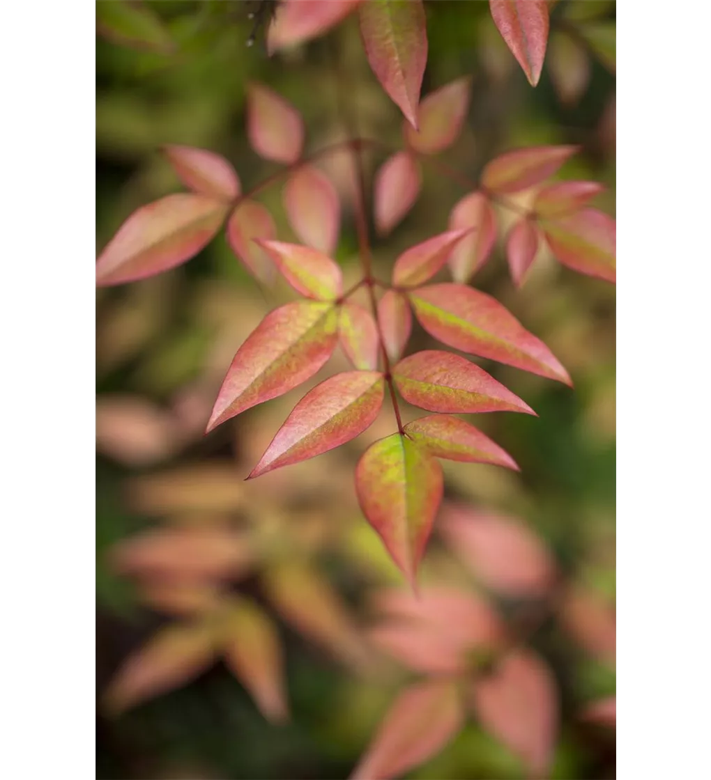 Der Heilige Bambus (Nandina domestica) ist ein immergrünes Laubgehölz mit lanzettlichen, grün-roten Blätter. Zum Herbst nimmt das Laub eine schöne purpurrote Färbung an. Ab Juli bringt er weiße Blüten hervor. Die roten Früchte des Heiligen Bambus sind ein Blickfang, wenn sie im Oktober reif sind. An einem sonnigen bis halbschattigen Standort mit durchlässiger, kalkfreier und saurer Erde wird er bis zu 2,5 m hoch und 1,5 m breit. Im Kübel auf Balkon oder Terrasse macht dieses Laubgehölz ebenso eine gute Figur.