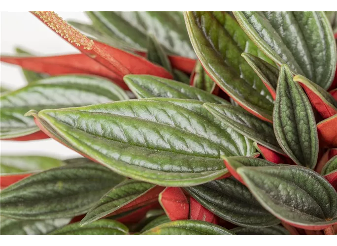 Die Pfefferpflanze 'Rosso' (Peperomia caperata) ist eine Zimmerpflanze, die mit ihren dekorativen Blätter begeistert: Die dickfleischigen oder herzförmigen Blätter sind grün-rot gefärbt. Ein Highlight sind ihre mittelgrünen Blüten. An einem sonnigen bis halbschattigen Standort und in durchlässigem, lockerem und nährstoffreichem Substrat wird sie bis zu 20 cm hoch und 25 cm breit.