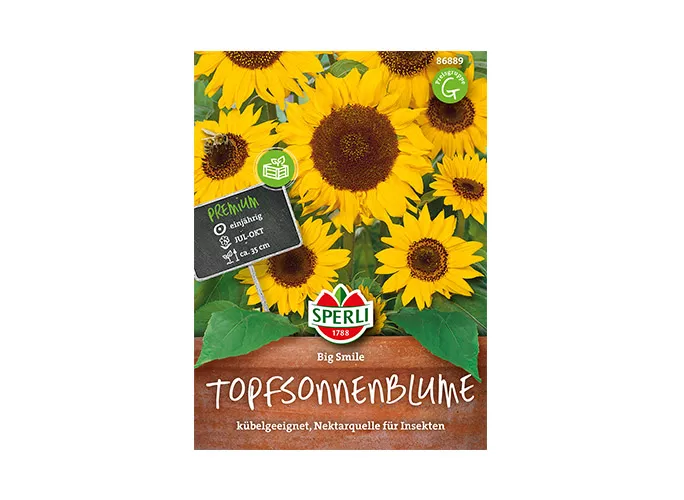Big Smile ist eine beliebte, kompakte Sommerblume. Eine frühblühende gelbe Sorte mit brauner Mitte. Bestens geeignet für den Anbau im Topf oder Balkonkasten. Höhe: 35 cm.