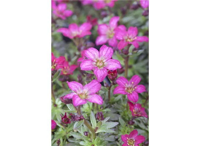 Der Garten-Moos-Steinbrech (Saxifraga x arendsii) ist eine wintergrüne Staude, die ab April mit prächtigen, rosafarbenen, roten oder weißen Blüten aufwartet. An einem halbschattigen Standort mit durchlässiger und nährstoffreicher Erde wird Saxifraga x arendsii bis zu 20 cm hoch und 25 cm breit.