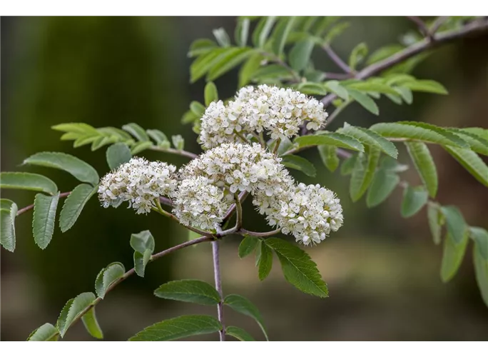 Von Mai bis Juni erscheinen die Blüten von Sorbus aucuparia 'Edulis'. Sie sind von weißer Farbe. Die Blüten sind in Dolden oder Rispen angeordnet.
