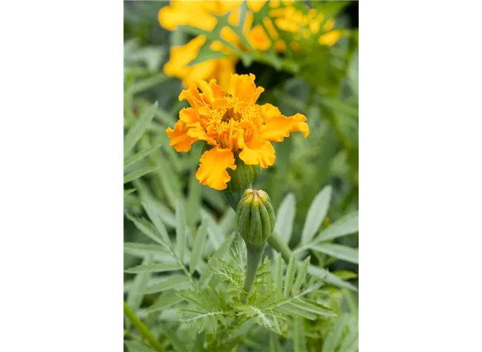 Die Aufrechte Studentenblume (Tagetes erecta) ist eine einjährige Pflanze, die ab Mai mit prächtigen, leicht duftenden, cremeweißen, gelben oder orangefarbenen Blüten aufwartet. Ihre gefiederten Blätter sind dunkelgrün. An einem sonnigen bis halbschattigen Standort mit humoser und nährstoffreicher Erde wird Tagetes erecta bis zu 80 cm hoch und 40 cm breit.